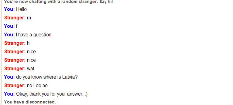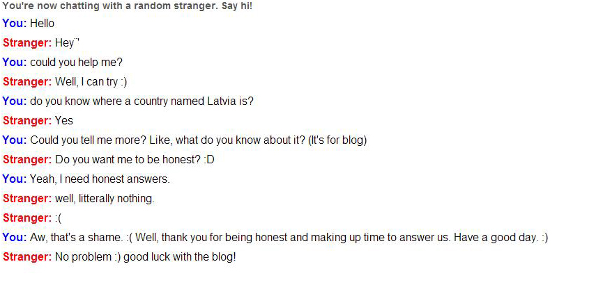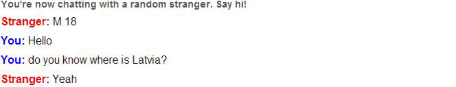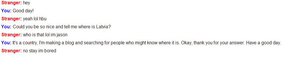 Yeah, I almost forgot. The other author of this blog (Signe), as requested, did a little experiment on Omegle (the pictures below). She asked to them: ”Do you know where is Latvia?” And it was interesting to see the results. Some strangers were nice and some weren’t. These aren’t the results you can get scientific proofs, but it’s still interesting.